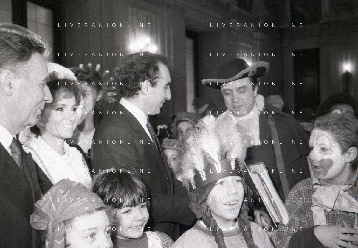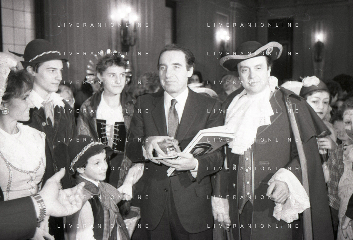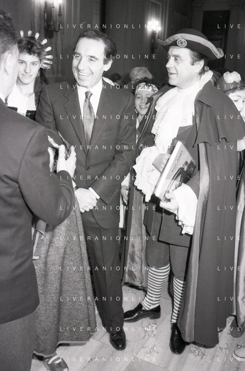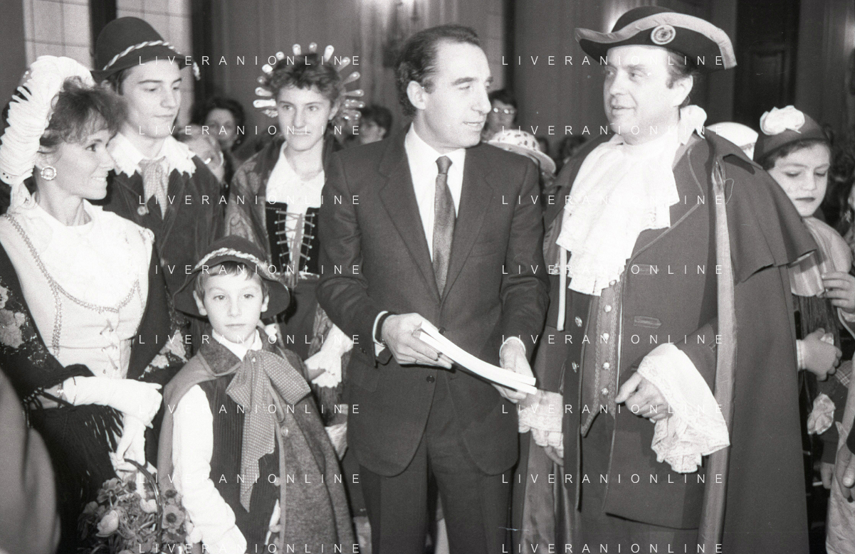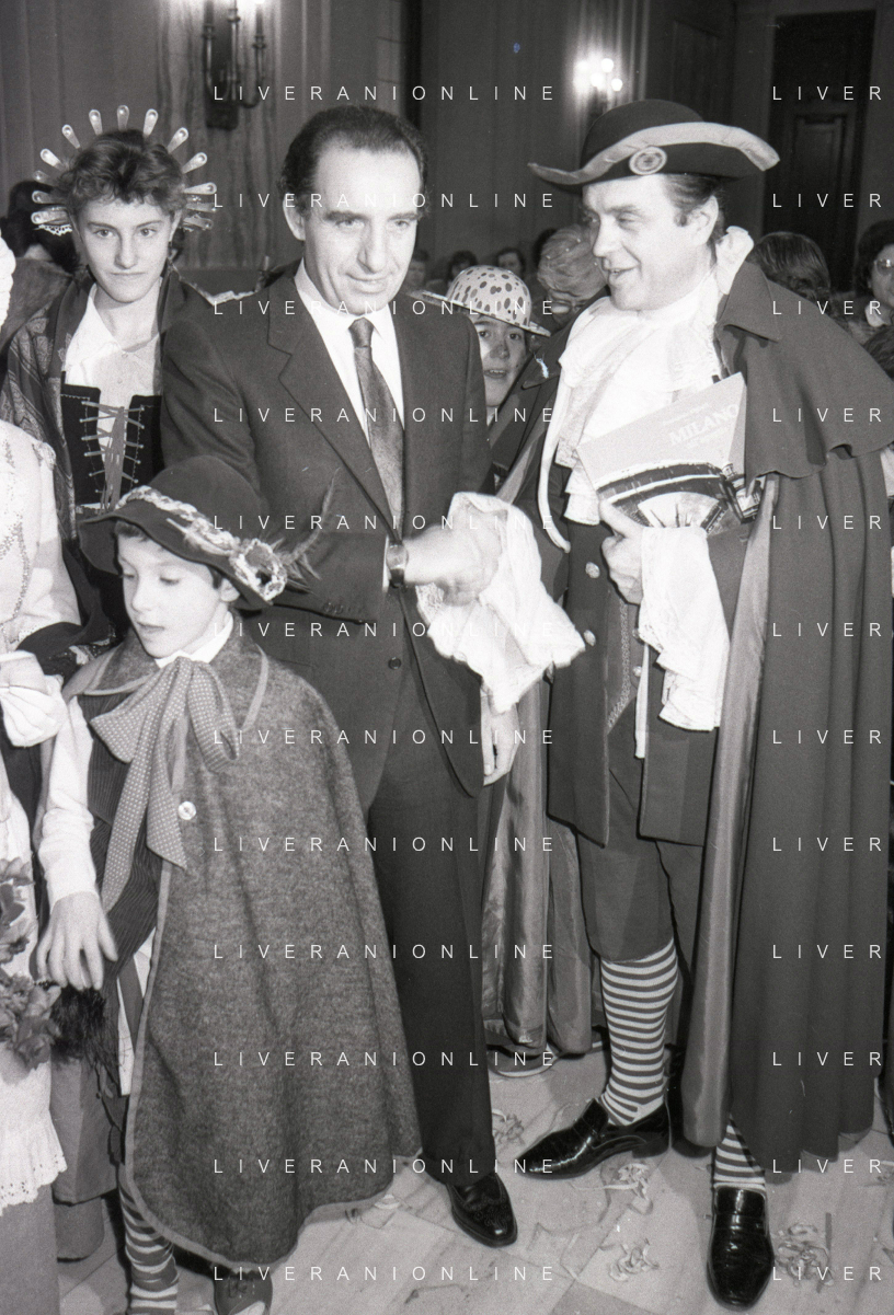 NEG RETROSPETTIVA PAOLO PILLITTERI SINDACO DI MILANO E POLITICO PARTITO SOCIALISTA ITALIANO NELLA FOTO PAOLO PILLITTERI SINDACO DI MILANO A PALAZZO MARINO CON MENEGHINO E CECCA MASCHERE DI CARNEVALE IL GIORNO 05-03-1987 AG ALDO LIVERANI SAS
