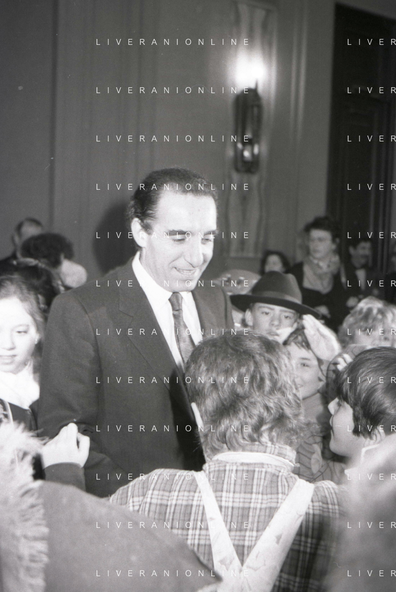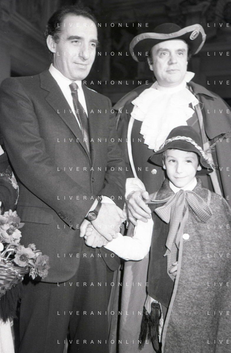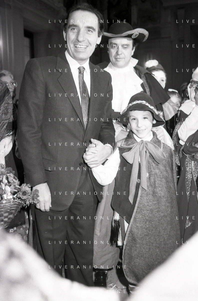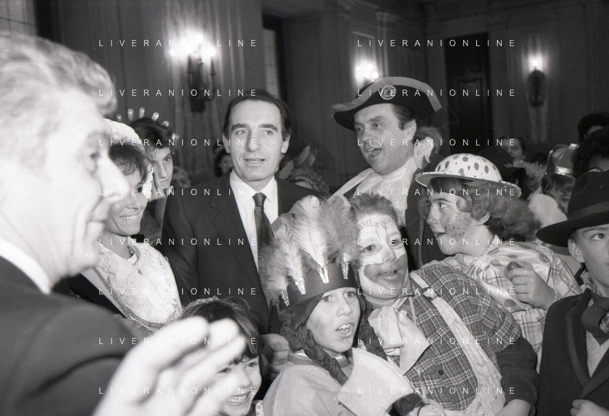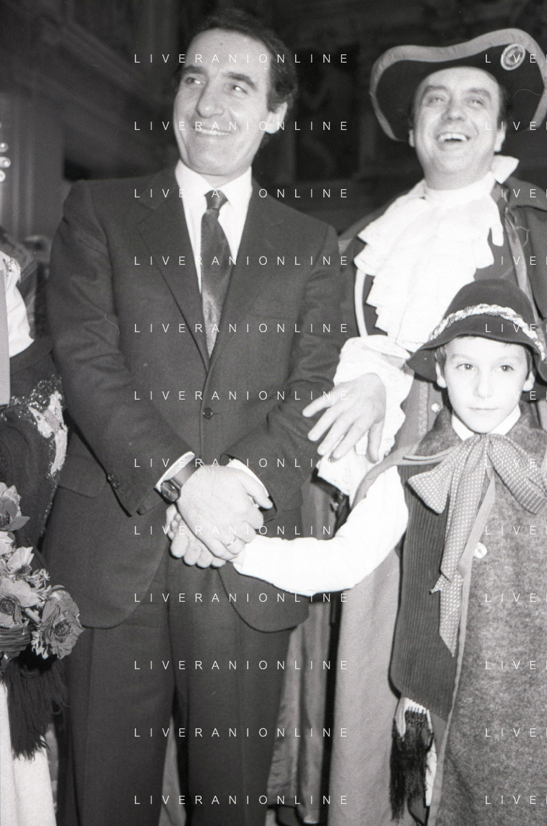 NEG RETROSPETTIVA PAOLO PILLITTERI SINDACO DI MILANO E POLITICO PARTITO SOCIALISTA ITALIANO NELLA FOTO PAOLO PILLITTERI SINDACO DI MILANO A PALAZZO MARINO CON MENEGHINO E CECCA MASCHERE DI CARNEVALE IL GIORNO 05-03-1987 AG ALDO LIVERANI SAS