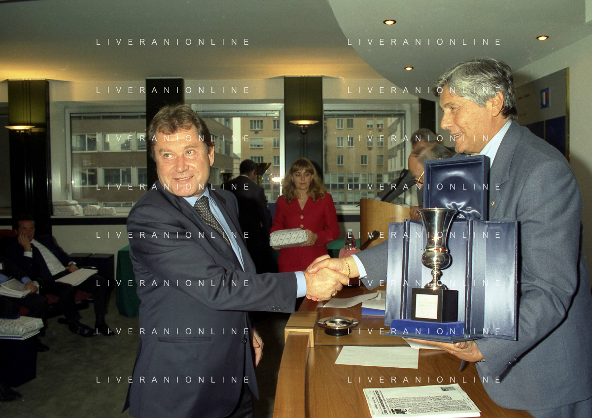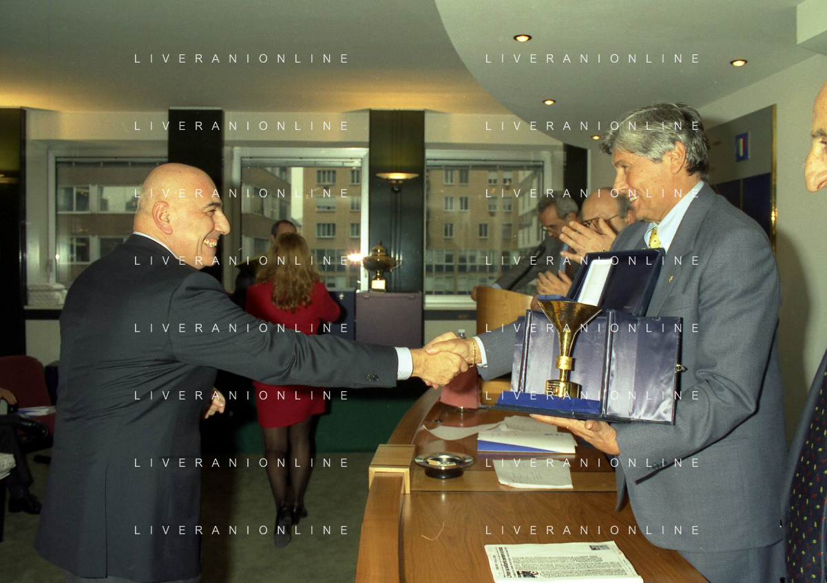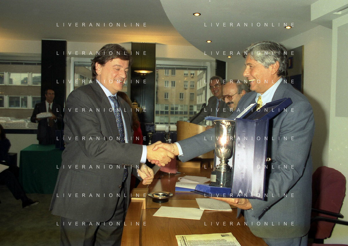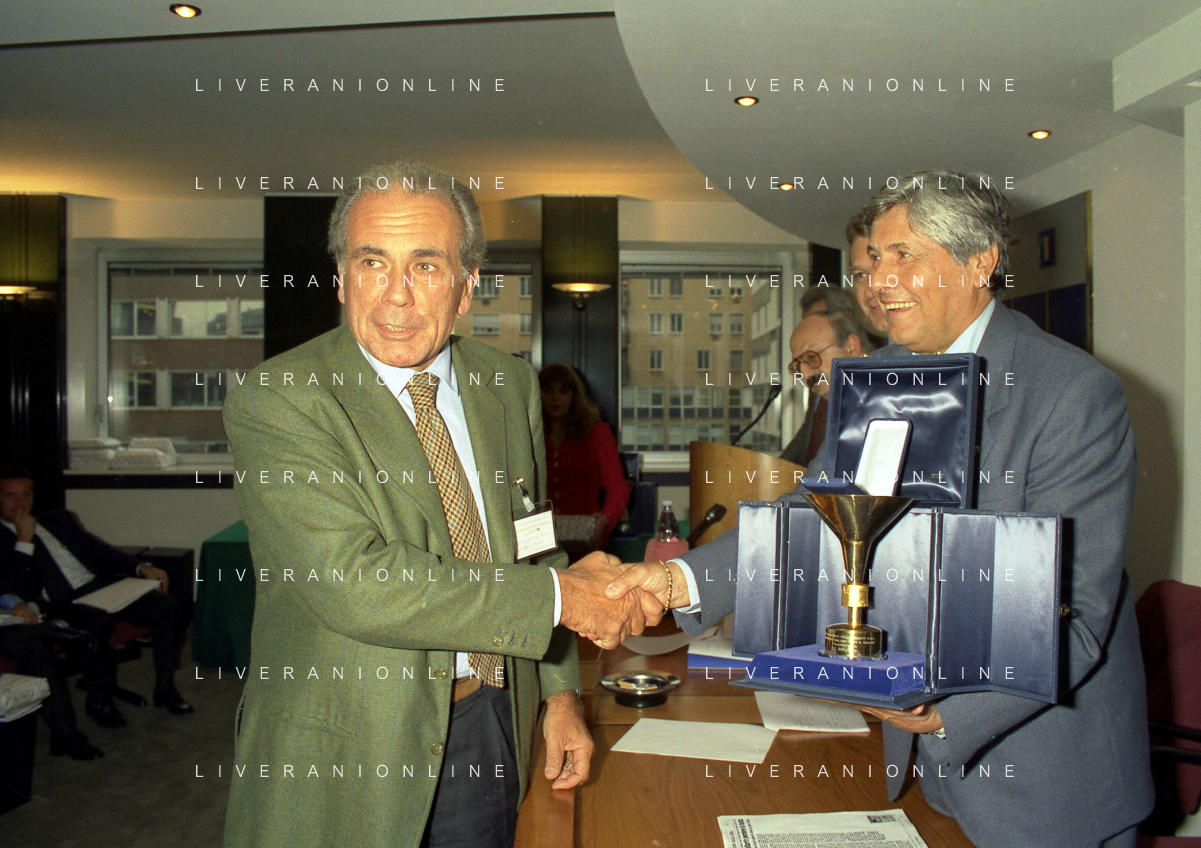 MILANO 25-10-1996 LEGA CALCIO VIA ROSSELLINI PREMIAZIONE SOCIETA E PRESIDENTI NELLA FOTO LUCIANO NIZZOLA CON GIUSEPPE GAZZONI FRASCARA AG ALDO LIVERANI SAS