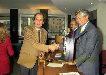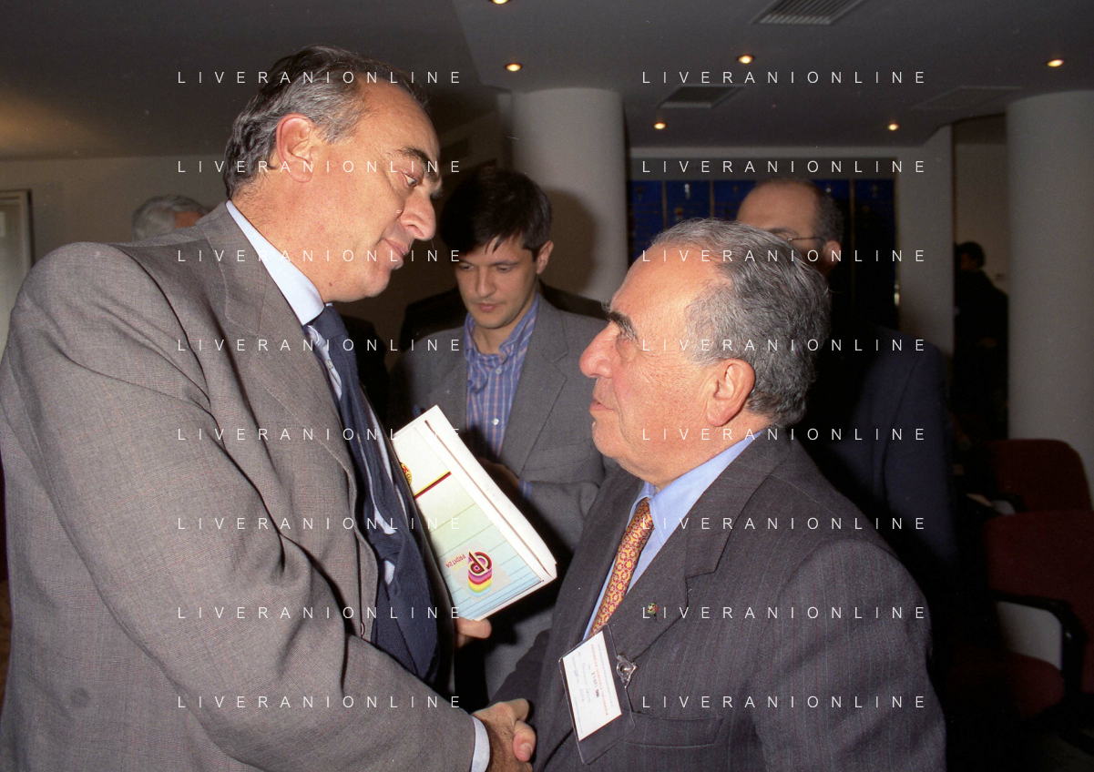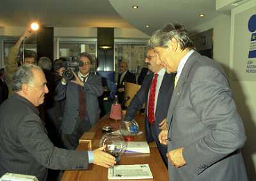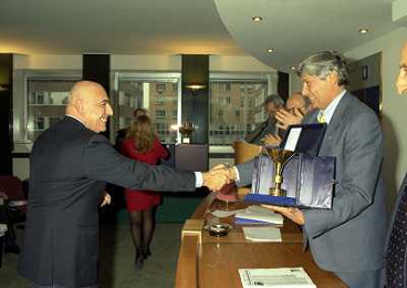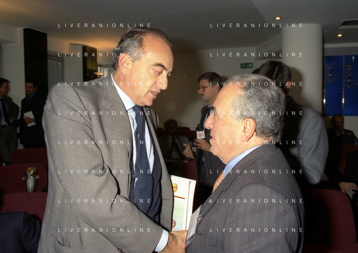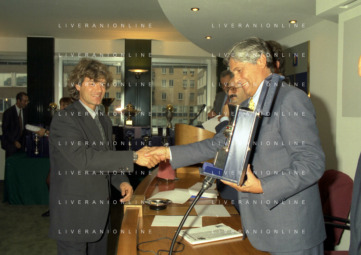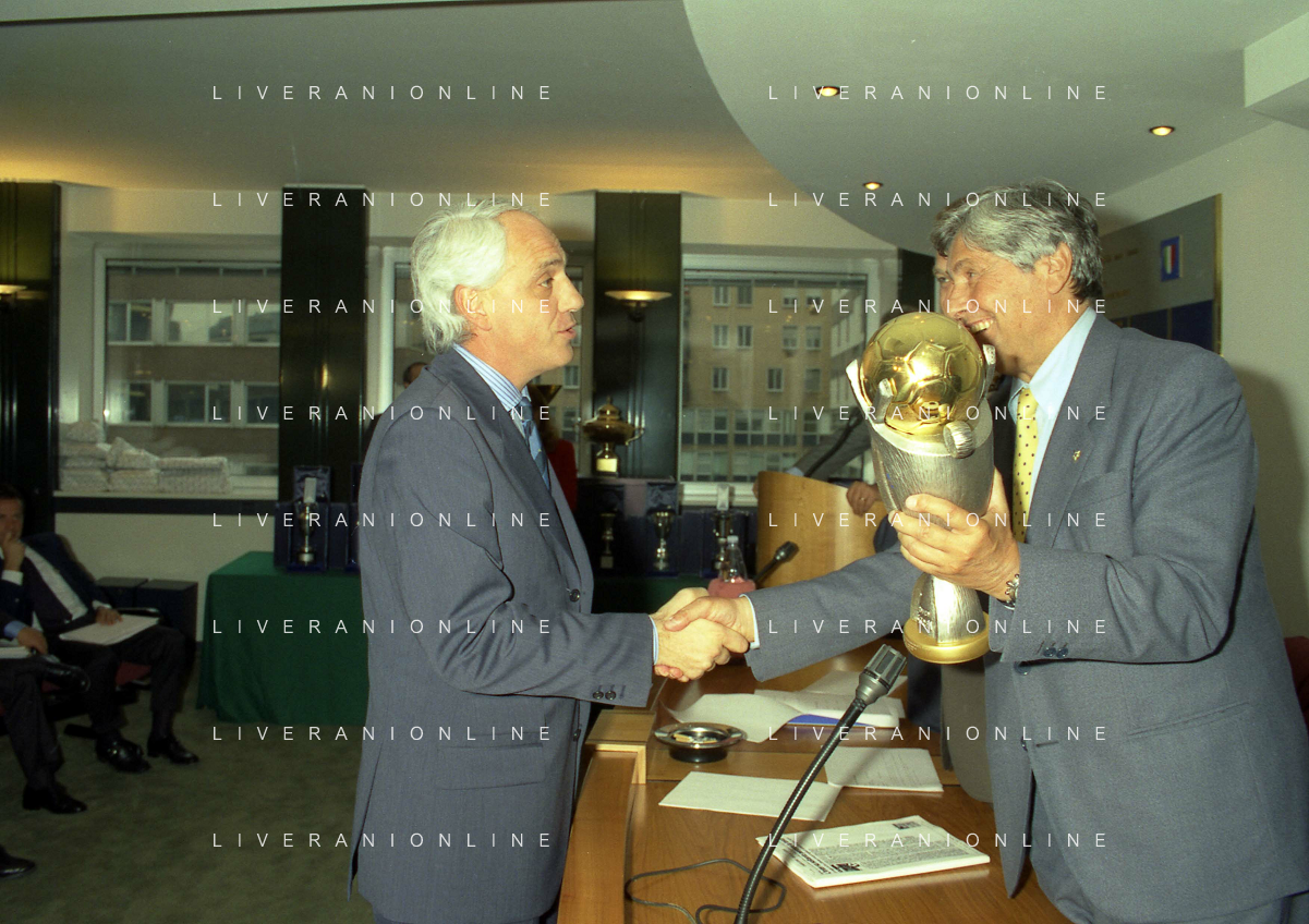 MILANO 25-10-1996 LEGA CALCIO VIA ROSSELLINI PREMIAZIONE SOCIETA E PRESIDENTI NELLA FOTO LUCIANO NIZZOLA CON GIUSEPPE GAZZONI FRASCARA AG ALDO LIVERANI SAS