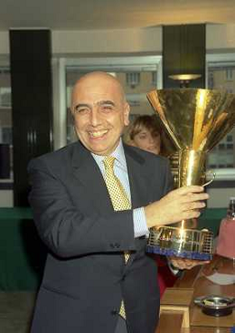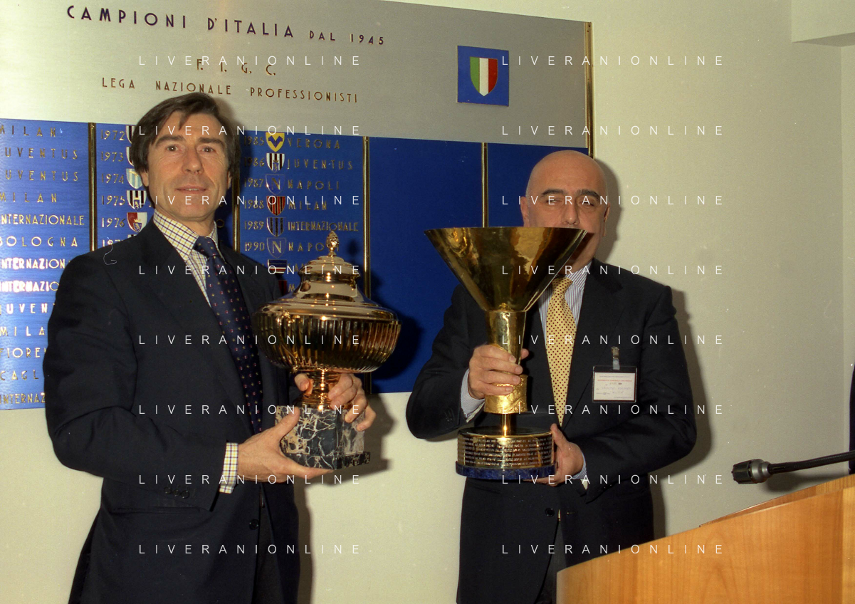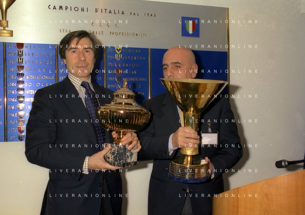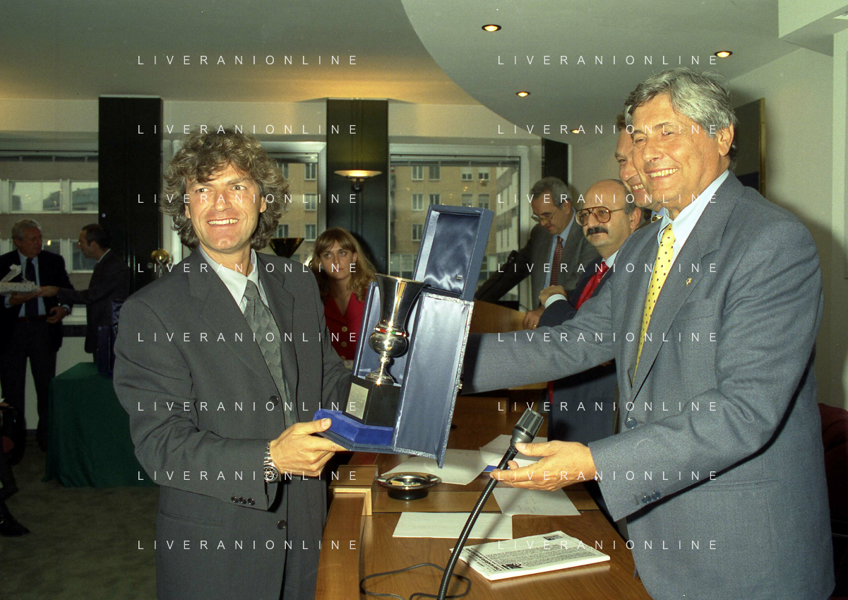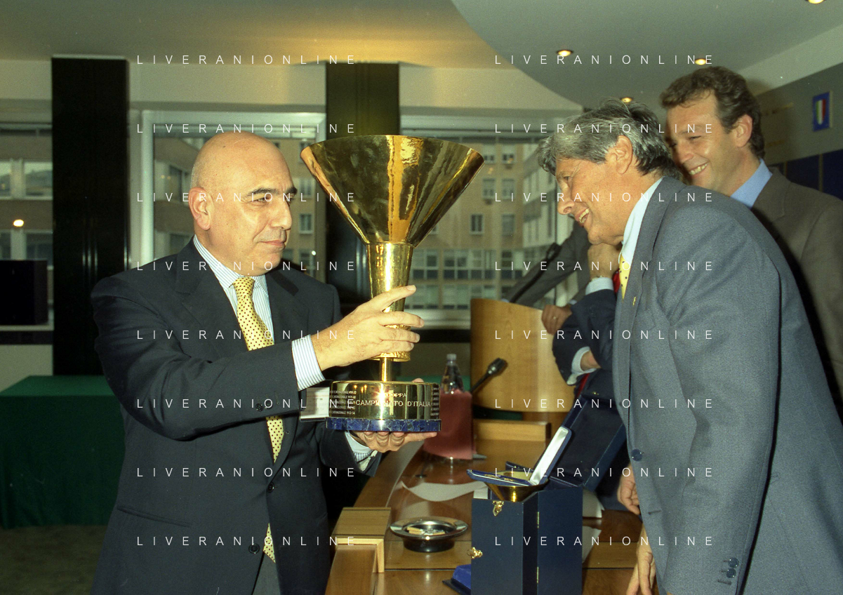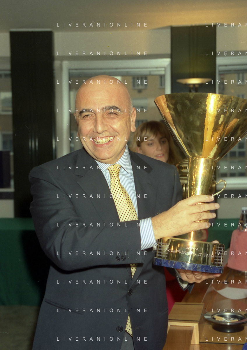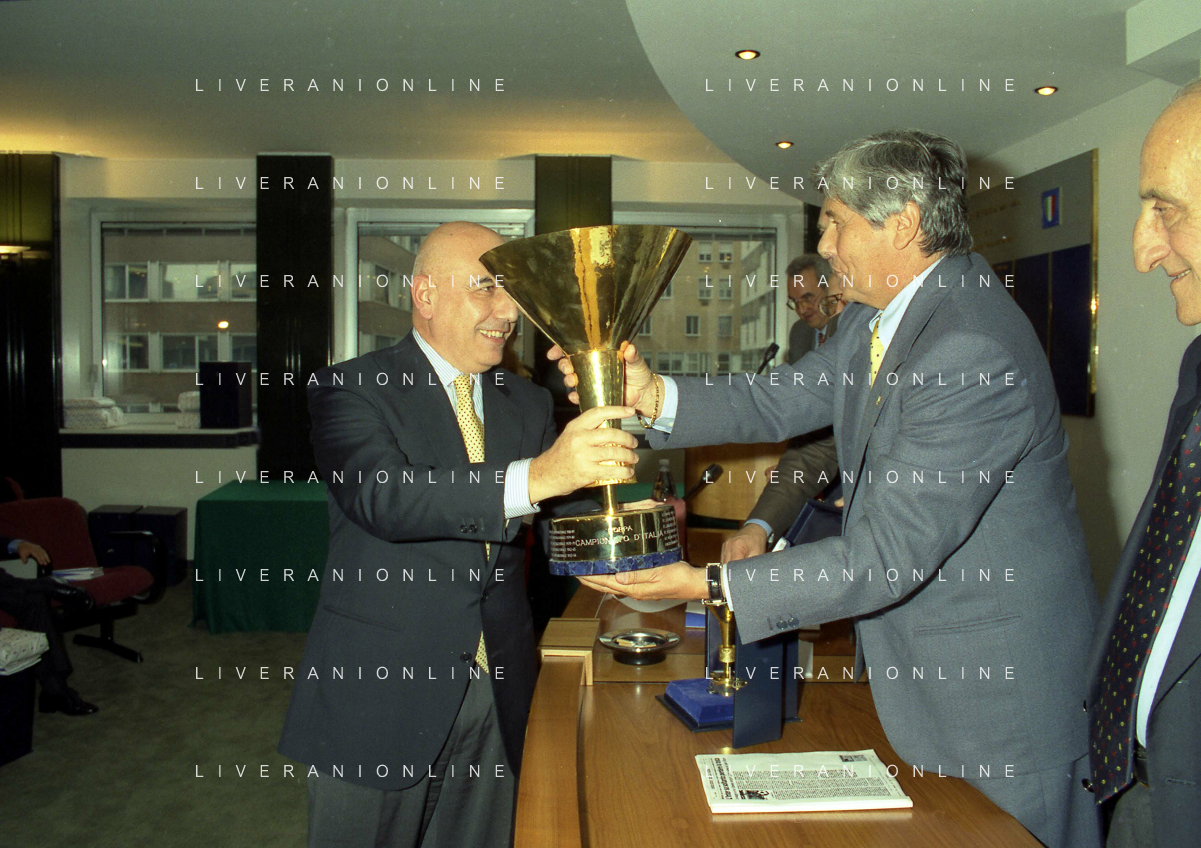 MILANO 25-10-1996 LEGA CALCIO VIA ROSSELLINI PREMIAZIONE SOCIETA E PRESIDENTI NELLA FOTO ADRIANO GALLIANI CON IL TROFEO DEL CAMPIONATO AG ALDO LIVERANI SAS