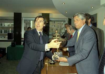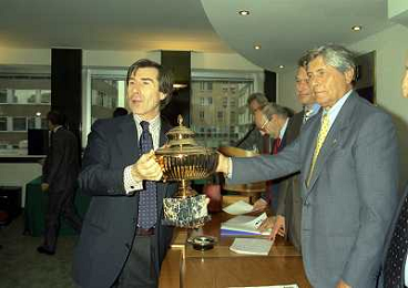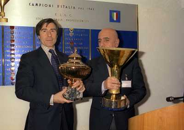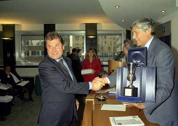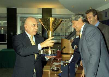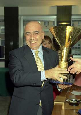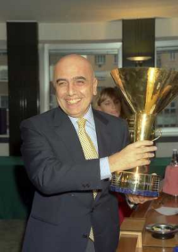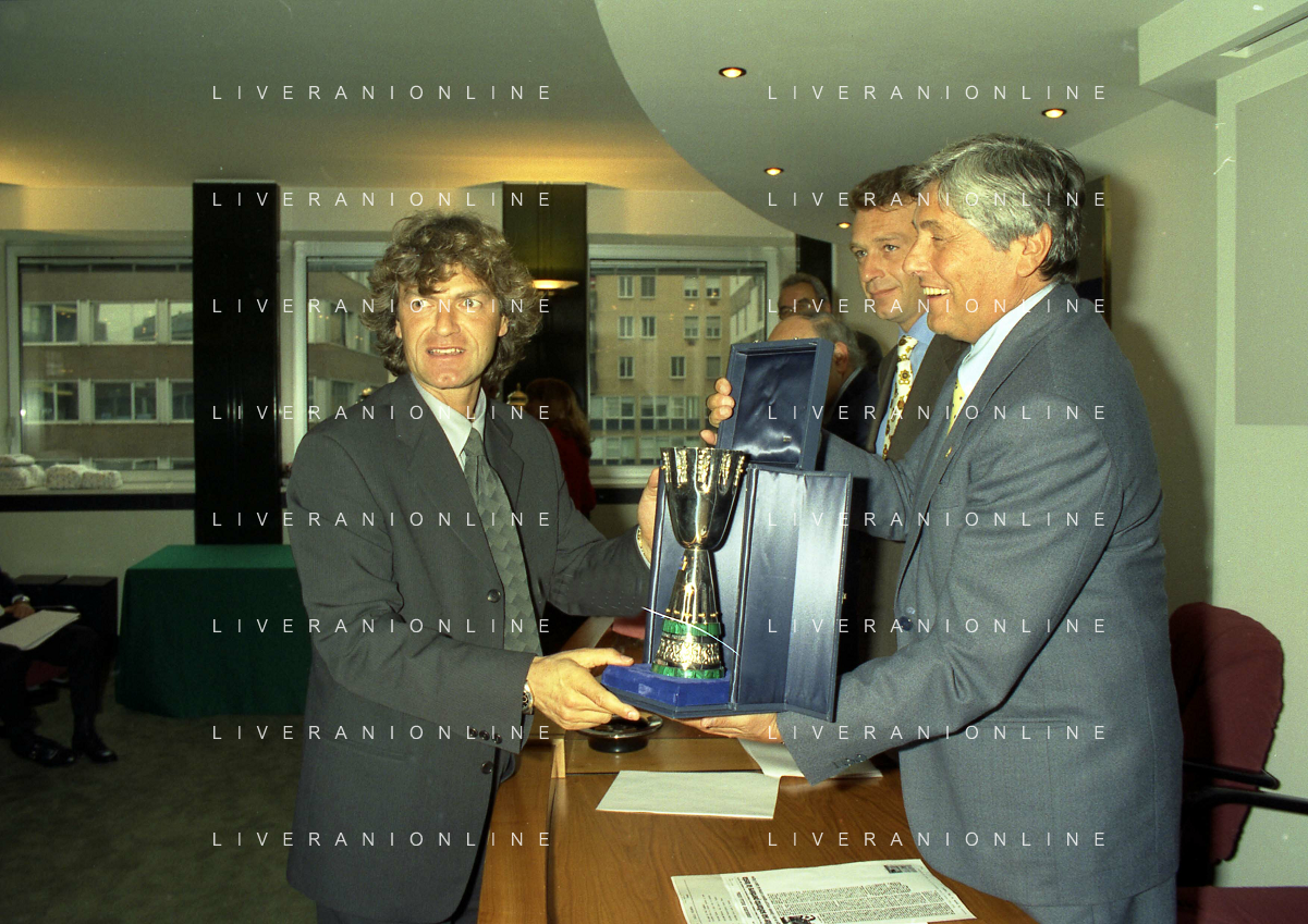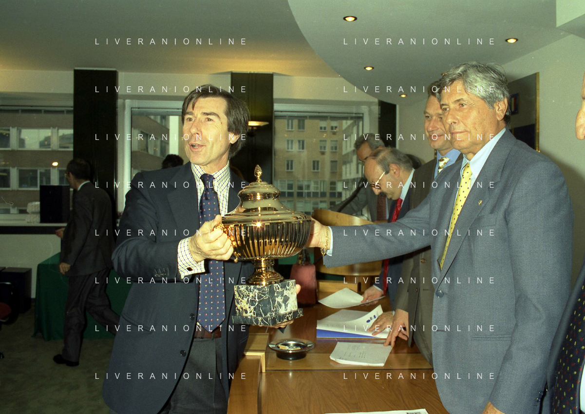 MILANO 25-10-1996 LEGA CALCIO VIA ROSSELLINI PREMIAZIONE SOCIETA E PRESIDENTI NELLA FOTO ADRIANO GALLIANI CON LA COPPA DEL CAMPIONATO AG ALDO LIVERANI SAS