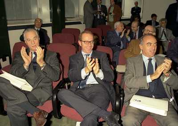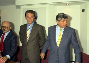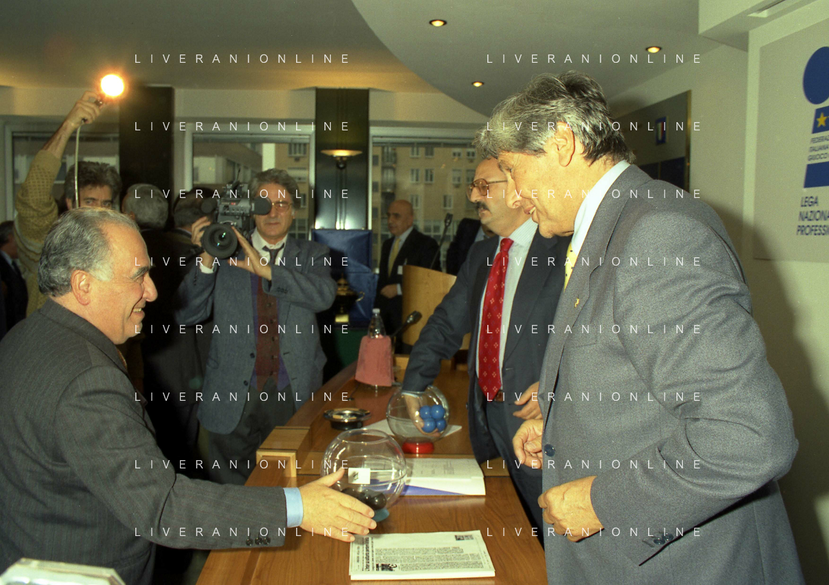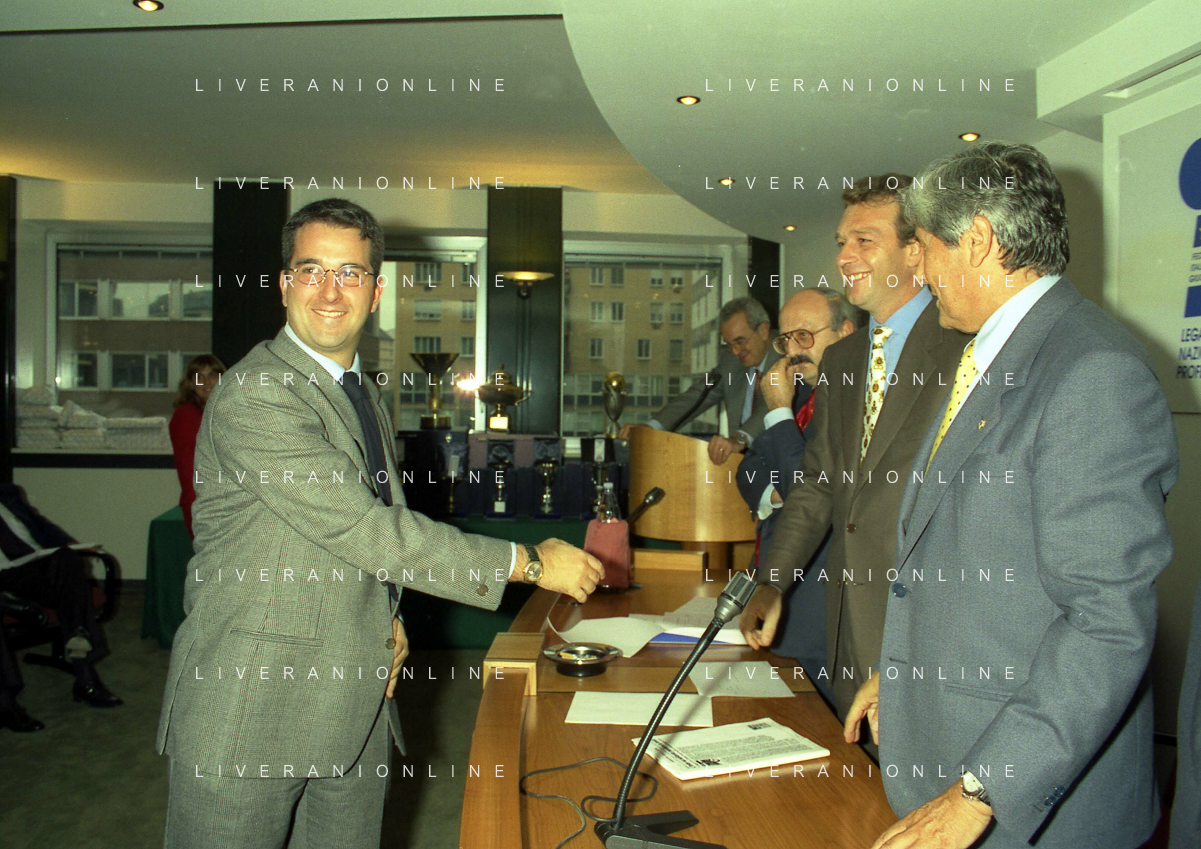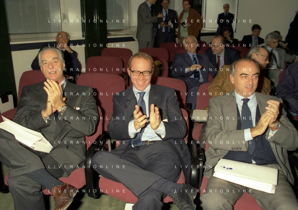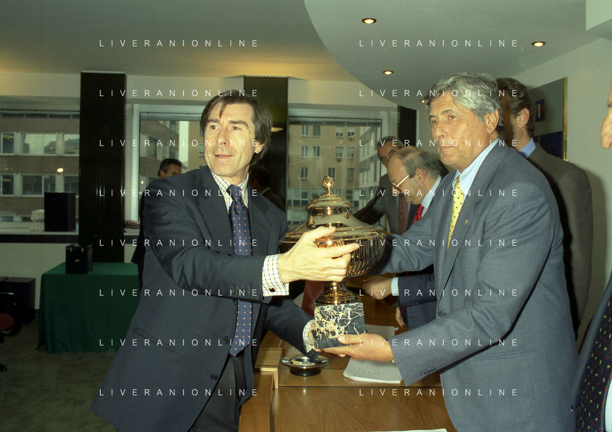 MILANO 25-10-1996 LEGA CALCIO VIA ROSSELLINI PREMIAZIONE SOCIETA E PRESIDENTI NELLA FOTO GIAN MARIA VISCONTI DI MODRONE-ENRICO MANTOVANI-ANTONIO GIRAUDO AG ALDO LIVERANI SAS